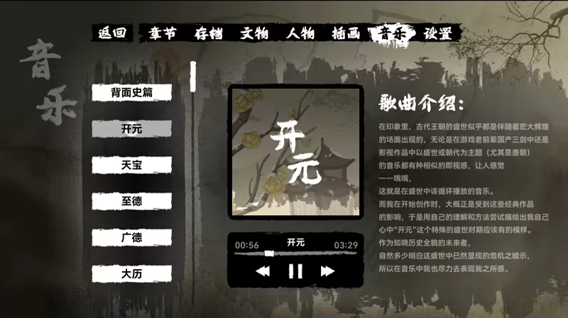 游戏配乐以唐王朝各年号所代表的时代氛围为线索,融合中原与西域的传统乐器,并以现代电子音乐加以点缀,展现出盛世之下暗藏危机的历史张力。我们尝试用旋律讲述历史,以音色表达感情,构建出恢宏大气又细腻动人的听觉体验。