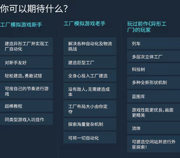 我们非常重视游戏的性能。因此我们在新的游戏引擎中完全重写了《异形工厂2》的底层代码,力求即便在全新的3D视角中也能够看到流畅运行的大型工厂!